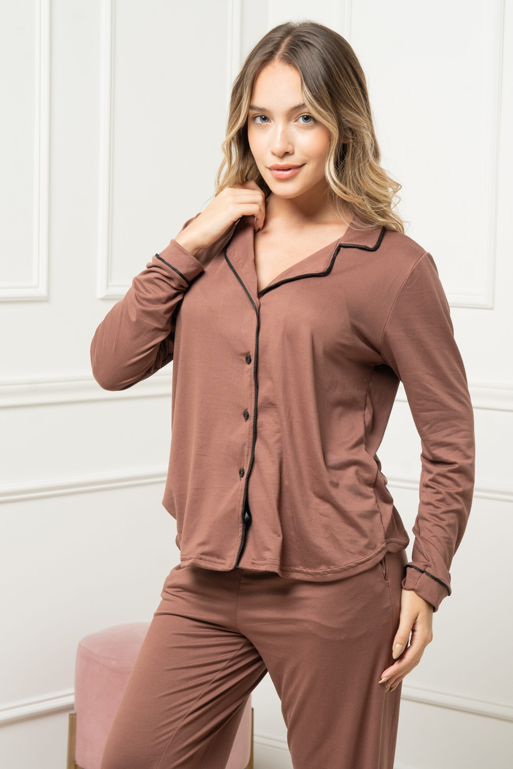 TRENDA L5604 SET PIJAMA CAMISA Y PANTALON DE MODAL GAMUZADO CON VIVO CONTRATONO